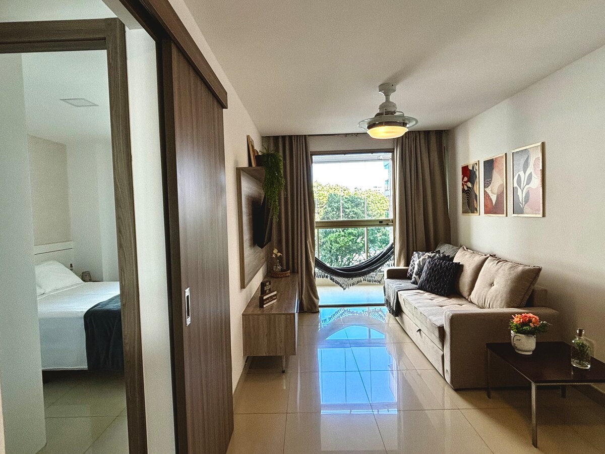 Piso extremadamente acogedor y equipado con todo lo necesario para una estancia perfecta. La comodidad cuenta con dormitorio y sala de estar completamente ventilados, privados, aire acondicionado para los que les gusta un ambiente más fresco, una vista increíble y una ubicación perfecta para que hagas todo lo que necesites en los alrededores. En el edificio, tienes seguridad total, un lugar de estacionamiento y una increíble piscina para refrescarte y relajarte en los días más calurosos. * EXCELENTE UBICACIÓN *