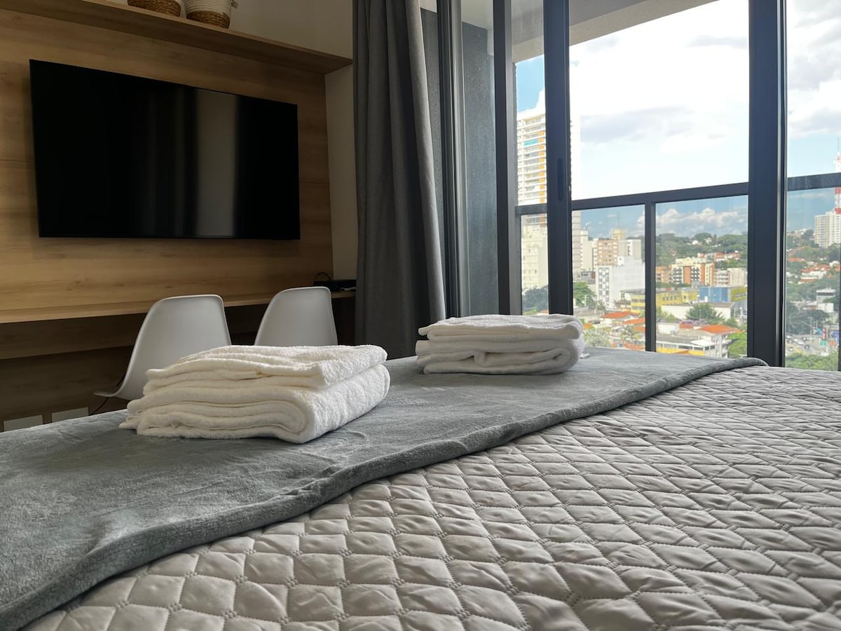 Estudio boutique con una de las vistas más bonitas de la ciudad de São Paulo. A 2 minutos a pie del metro. Cocina totalmente equipada con nevera escondida por una puerta de madera. Wifi, aire acondicionado y TV inteligente de 55 pulgadas. Registro autónomo con cerradura electrónica inteligente. Juega al tenis o ve al gimnasio y relájate en las piscinas (al aire libre o cubiertas climatizadas) y saunas (húmedas o secas) después. El área común también incluye espacios de coworking y lavandería. Los visitantes deben estar previamente registrados en la recepción.