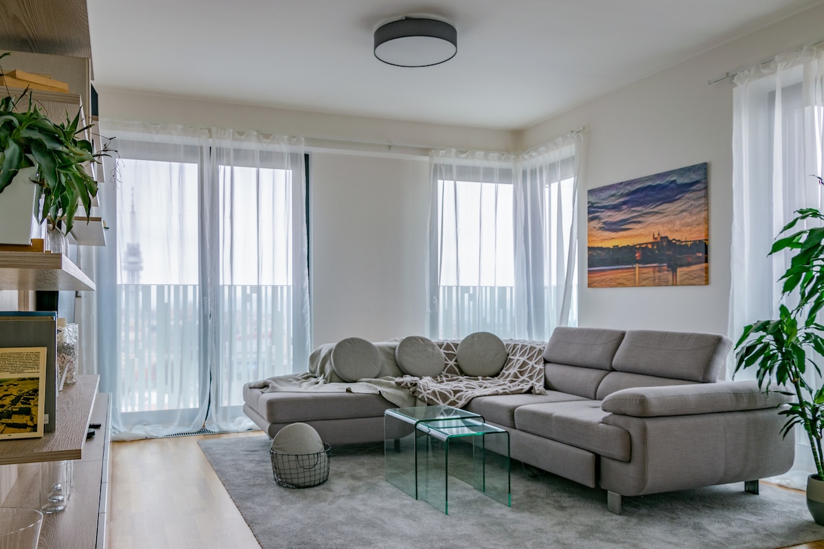 Alójate en Praga rodeado de lujo, arte y diseño. Un lugar elegante y tranquilo con todas las comodidades necesarias te abrazará cálidamente y permitirá una vida cómoda en la parte residencial más atractiva de la ciudad. Estamos deseando recibirte para tu estancia de media o larga duración. La suite está bien equipada y te da la bienvenida con una gran cocina y comedor, TV moderna con Apple TV, O2 TV y servicios de Netflix, dormitorio muy privado y acogedor (colchones de lujo, edredones de primera calidad) y material para hacer ejercicio como esterilla de yoga, mancuernas o cuerda para saltar.