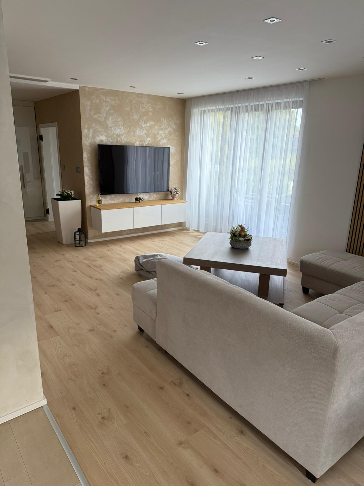 Luxury cubist villa apartment in a quiet green residential area. The fully original furnished flat with a private entrance has an area of 75 m². Secure parking in front of the house. Big beautiful garden. Kitchen (full equipped), bedroom for 2 people (bed for babies is available), living room (we can arrange a mattress for third person, ideally a child or a teenager), bathroom with bath and shower (bathrobes are included). Washing machine and dryer. Dogs are welcome for a fee of 10 EUR/day.