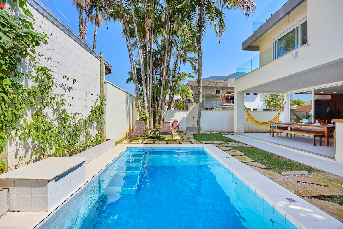 Casa Nova 30mts do Mar dentro del condominio Salga en Praia da Lagoinha - Ubatuba - SP . Casa entera con aire acondicionado con 5 suites (1 en la planta baja) completas, donde podrás disfrutar de tu piscina climatizada (30°C todo el año y con una valla protectora) y una zona gourmet completa donde podrás elegir entre hacer tu barbacoa en una parrilla de gas o de carbón. Playa súper tranquila, familiar y ideal para niños. Cuenta con 2 sombrillas y 8 tumbonas Capacidad para 14 personas Tiene wifi