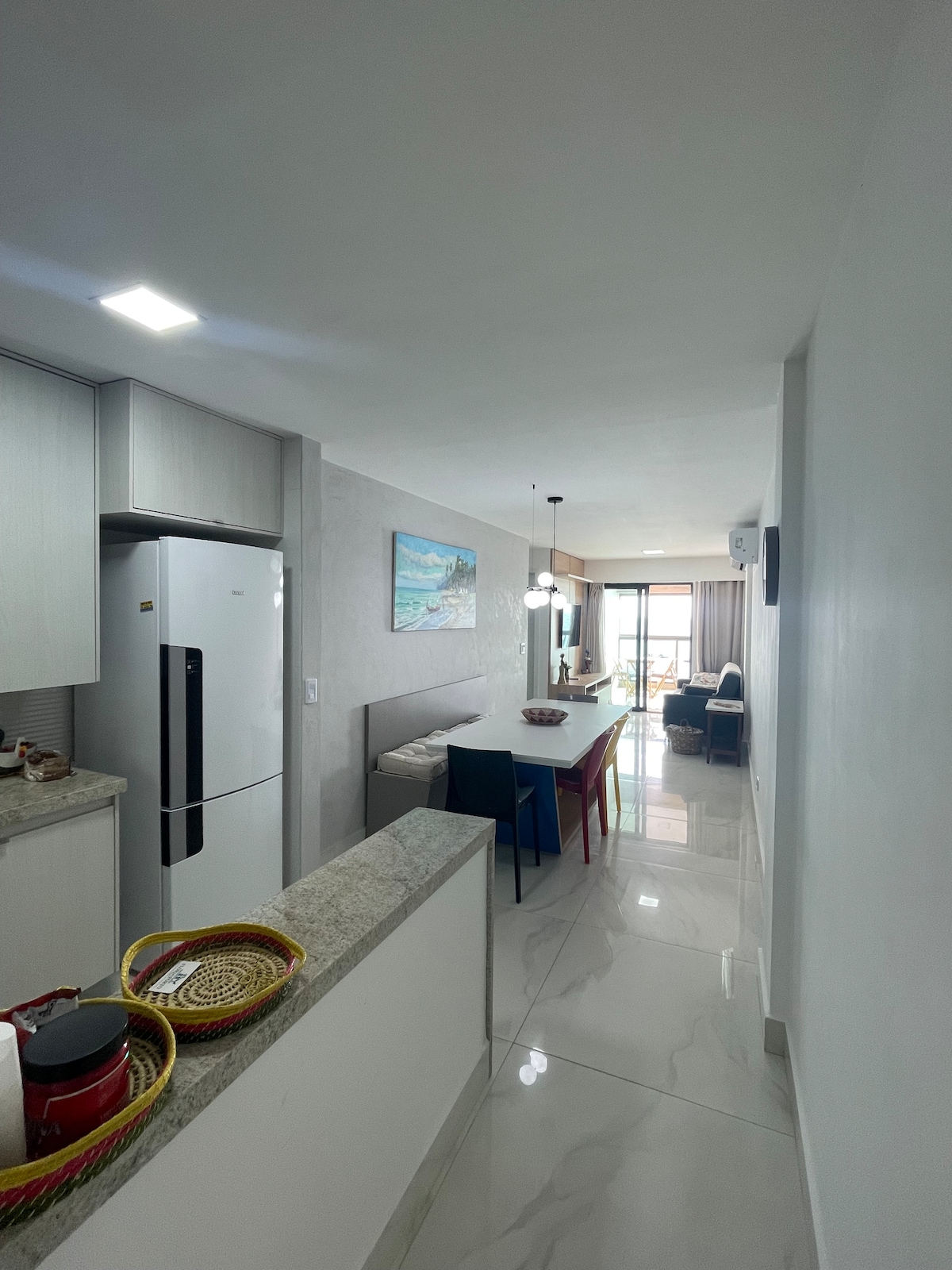 Acogedor apartamento, con cocina abierta, sala de estar con sofá cama, aire acondicionado, TV inteligente, balcón y un dormitorio con cama doble, aire acondicionado y armario. Cocina con todos los utensilios, microondas, licuadora, sandwichera, nevera, cafetera, vajilla y freidora de aire. Enxoval Ducha con calefacción de gas Wi-Fi Zona de ocio en la azotea con espejo de agua, vistas al mar, piscina para adultos y niños al atardecer Maraca Beach II está a 50 m de la playa, con ascensor, conserje 24 horas y acceso también por Beira Mar