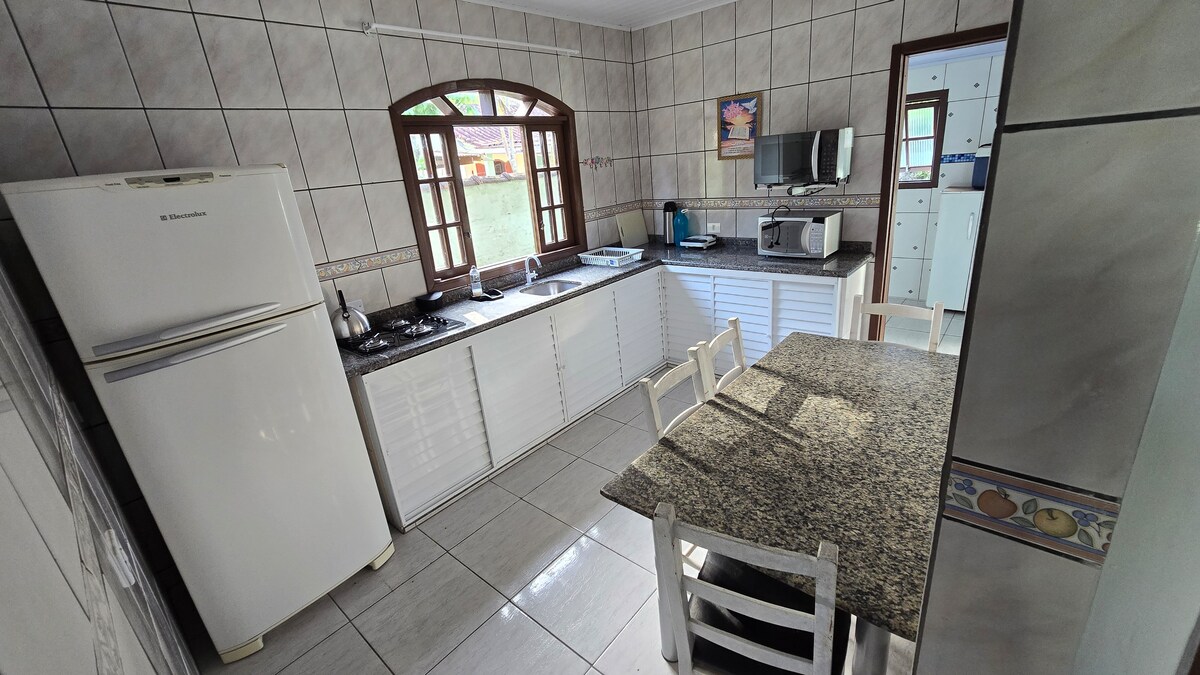 Está a 1 manzana de la playa. Con salón/cocina (bicama) + 1 dormitorio (suite, cama doble), tiene todas las comodidades para que el huésped ahorre dinero y cocine en el sitio (estufa, nevera y utensilios domésticos, barbacoa y lavandería al aire libre). Tiene capacidad para 4 personas. Está en la parte de atrás de mi casa, tiene una puerta divisoria entre las casas. Se admiten mascotas, siempre y cuando sean dóciles. El coche debe estar aparcado en paralelo a la calle (barrio tranquilo). Advertir sobre el check-in después de las 21:00, ya que serán evaluados.