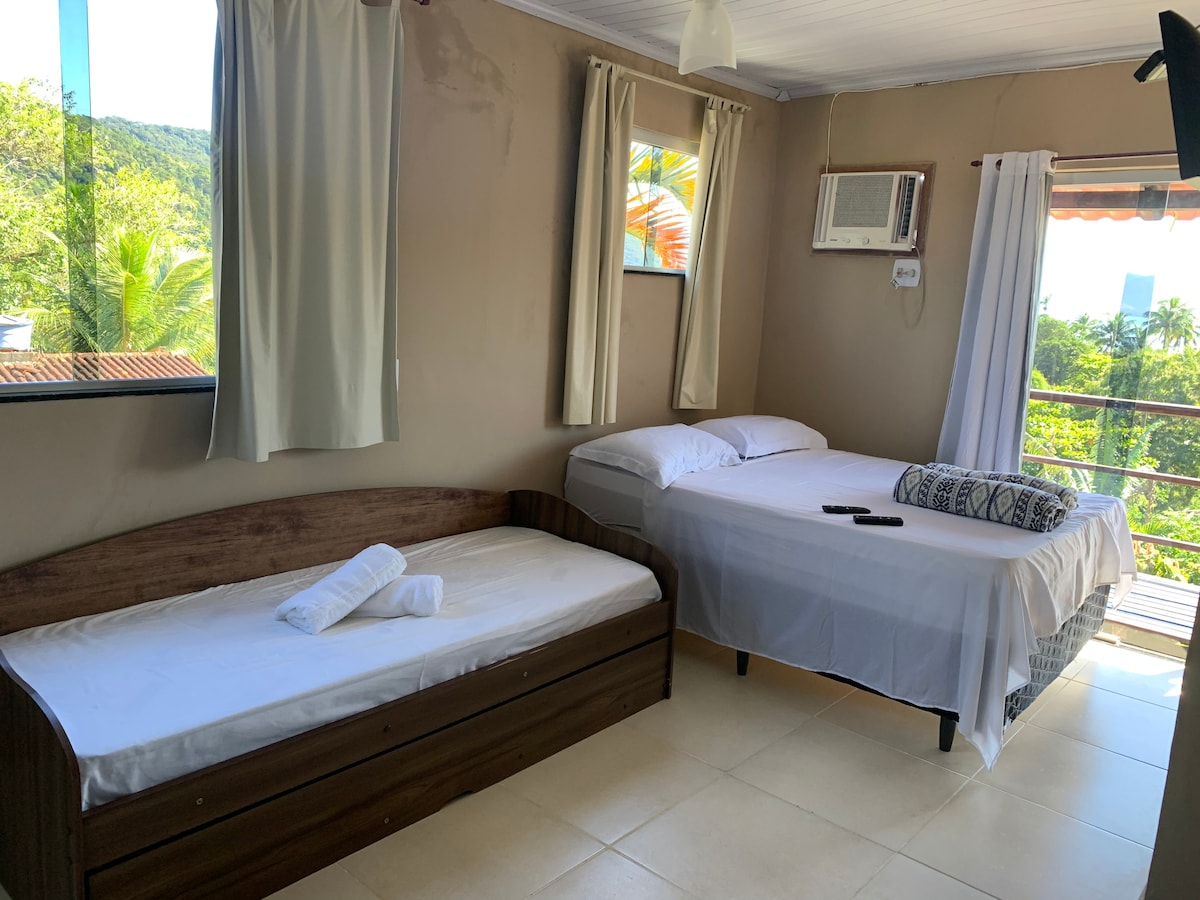 Ofrezco una suite completa, de 20 m2, equipada con cocina y electrodomésticos, estamos en la calle de flores subiendo a la izquierda a la izquierda a 4 casas a la izquierda, un lugar de impresionante naturaleza, cantos de pájaros todo el día y un paisaje para el mar y para las montañas de la playa de Abraao.
