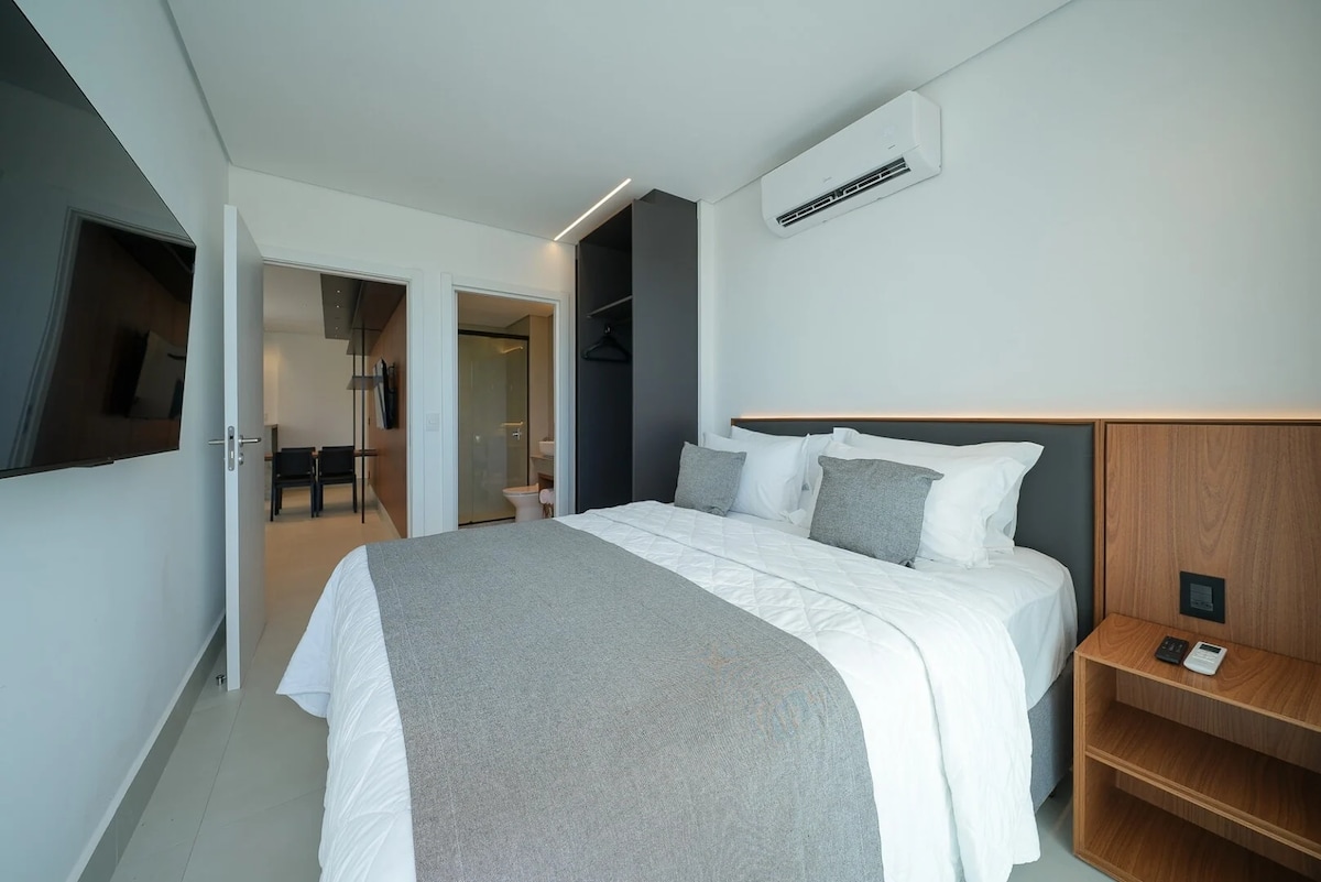 Relájate con estilo mientras te hospedas en este lujoso alojamiento en Porto Alto Resort, situado frente a la playa de Muro Alto. Departamento con dos habitaciones, sala de estar integrada con mini cocina (minibar y microondas) Sofá cama doble grande, TV39", aire acondicionado. Habitación con TV de 39pulgadas, aire, balcón, incluido almacenamiento diario, ropa de cama y de baño. Área de juegos completa con piscinas para adultos y niños, sala de juegos, restaurante con bufé (opcional), gimnasio, salón de belleza, cuidado de perros, spa (opcional).