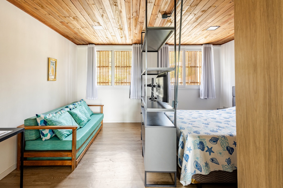 Un pequeño refugio en la barra de Ibiraquera, estudio ubicado en la parte trasera de una casa, con pasillo de entrada privado y zona privada totalmente vallada. Situado junto al mar, es una gran opción para las parejas que quieren tomarse unos días para descansar. El estudio tiene todo lo que una pareja necesita para estar bien acomodada, cocina equipada, aire acondicionado, cama queen size, bañera. La decoración está inspirada en la encantadora Tailandia.