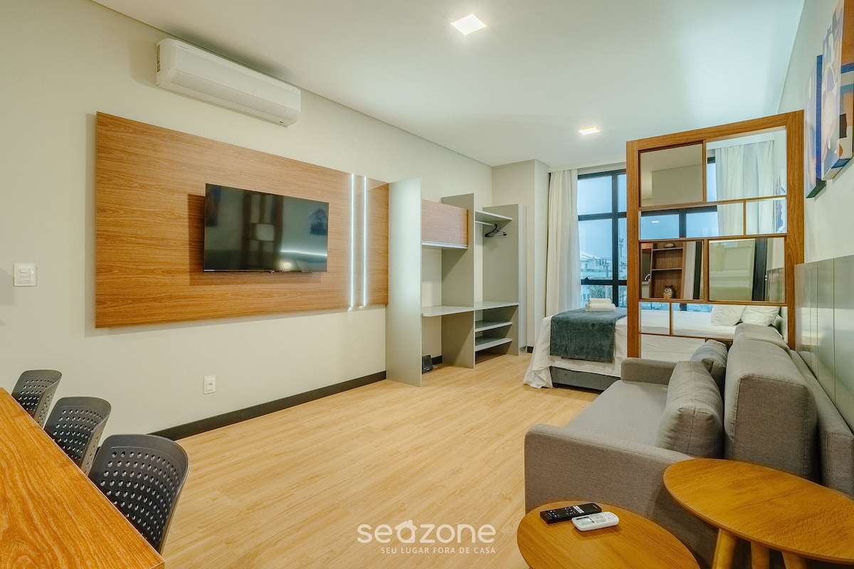 ¡Disfruta de lo mejor de Florianópolis! Este moderno estudio se encuentra a solo 550 metros de la Praia dos Ingleses. El espacio cuenta con aire acondicionado, wifi, Smart TV, cocina totalmente equipada y una cama queen size para tu comodidad. Las comodidades del condominio, como piscina, zona de barbacoa, espacio de coworking y gimnasio, enriquecerán tu experiencia. ¡Vive una experiencia completa de vacaciones y trabajo! ¡Haz clic y reserva tu estancia!