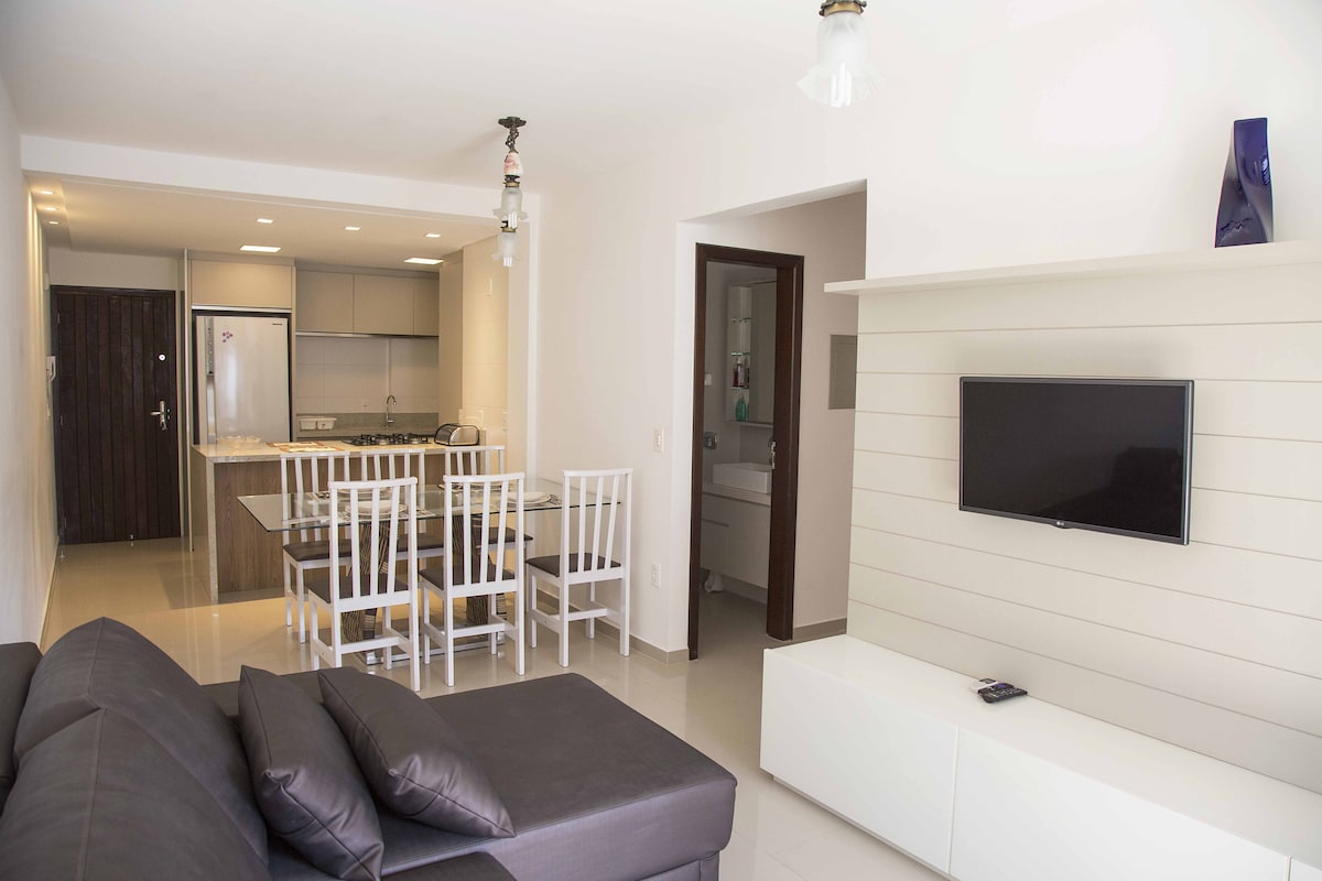 Mi espacio está FRENTE AL MAR, a 20 metros de la playa. Te encantará mi espacio por la VISTA, la barbacoa PRIVADA, el balcón FRENTE AL MAR, el ambiente cómodo, acogedor, decorado y NUEVO. Cocina COMPLETA. Excelente para parejas, aventuras individuales y familias (con niños). Ventana eléctrica de PVC, con aislamiento termoacústico. Aire acondicionado (split) en todas las habitaciones. 2 televisores LED. APARTAMENTO ENTERO. Edificio con espacio gourmet, piscina para adultos/niños en la azotea. Infraestructura para vacaciones en pareja/familia.