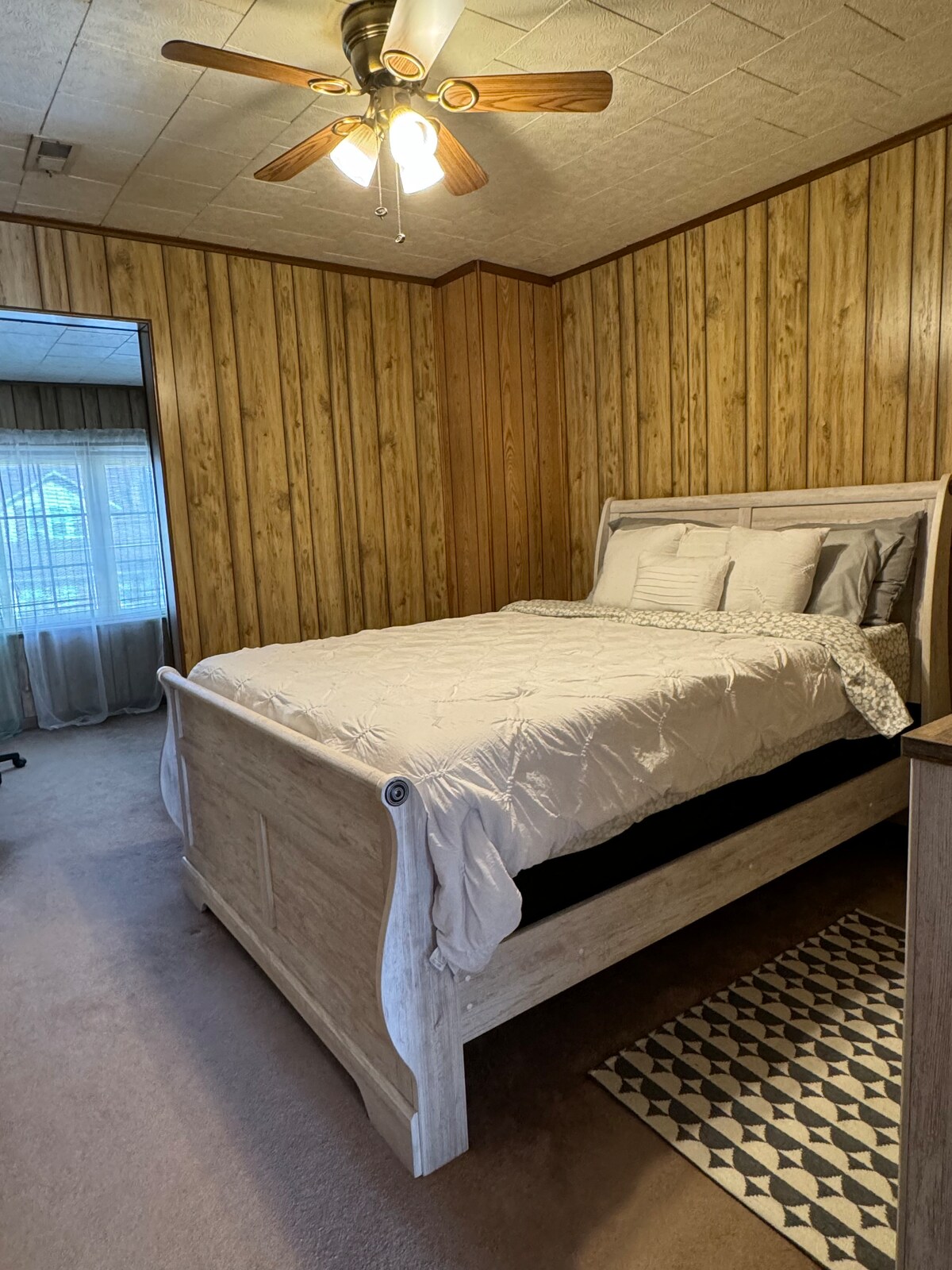 Esta suite remodelada, ubicada en la mitad trasera de una casa dúplex, da a nuestro terreno boscoso de 26 acres y a pocos pasos de un pequeño estanque. Tiene 2 porches con su propia entrada privada. Esta suite tiene un área abierta que tiene un dormitorio king, cocina, comedor y sala de estar, 1 baño completo y una lavandería. Tiene un dormitorio adicional que tiene una cama completa, su propia televisión y puerta con cerradura. Esta propiedad está a 15 minutos de 2 hospitales principales, la Universidad Marshall, el centro de Huntington y el centro comercial Huntington.