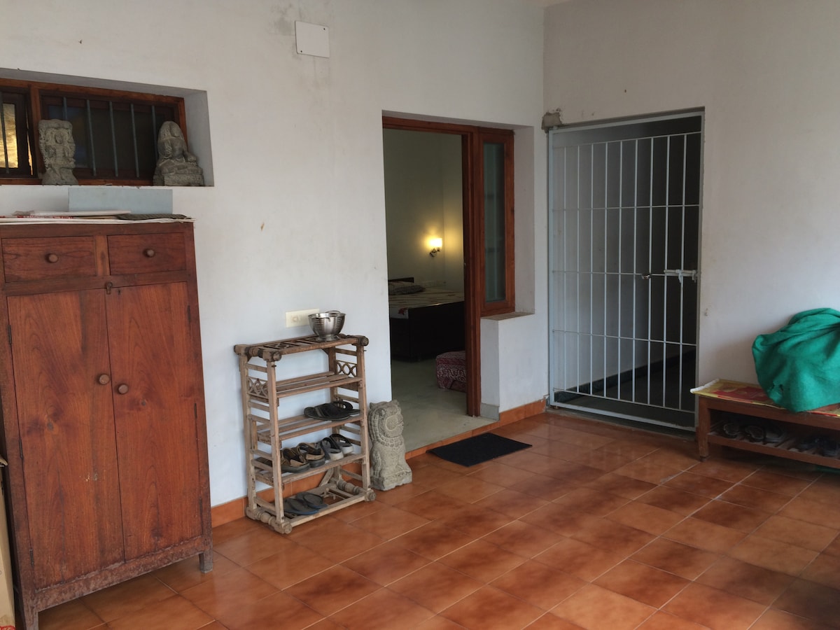 Este apartamento de 1 dormitorio en planta baja con un vestíbulo, cocina funcional y baño adjunto es un espacio totalmente privado sin compartir ninguna zona. Está a poca distancia a pie de la playa de Promenade, Rock Beach, Ashram, White Town, el mercado y buenos cafés. El lugar está cerca de la Ciudad Blanca y aún cerca de la naturaleza y un entorno muy tranquilo. Todas las ventanas dan a un enorme terreno verde. Tiene cocina totalmente funcional con utensilios, congelador, aire acondicionado, hervidor de agua, TV, wifi de alta velocidad. Necesitamos pruebas de identificación de todos los huéspedes.