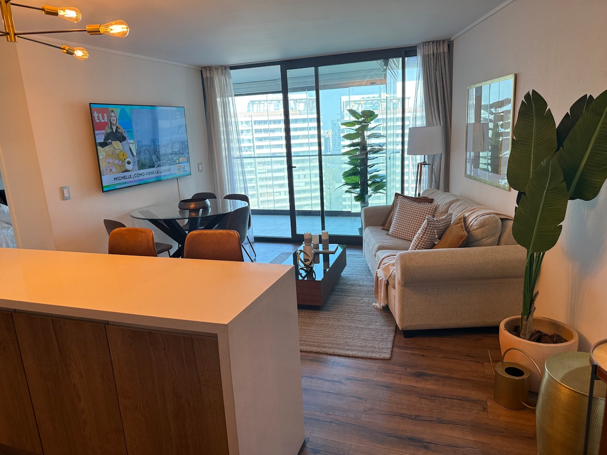 Departamento de Alto Standard ubicado en excelente sector de Santiago, a pasos del Parque Arauco, restaurantes y centros comerciales, y próximo a clínicas, zonas de interés turístico y agencias de ski. Vivirán como locales, con impresionantes vistas a la Cordillera de Los Andes y todas las comodidades para hacer que su estadía sea inolvidable. El departamento está pensado como un refugio elegante e inspirador. Se sentirán como en casa y disfrutarán de un espacio acogedor y relajante.