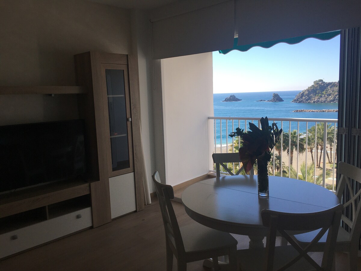El apartamento tiene unas vistas inmejorables, mirando al mar, ya que esta situado en primera linea de playa. Tiene una terraza muy soleada y agradable donde podras disfrutar de un desayuno mirando al mar. La decoracion es muy actual ya que el apartamento esta recien reformado. Tiene todas las comodidades para que disfrutes de unos dias formidables. Es muy tranquilo pero a la vez tiene mucha vida porque esta situado en el centro de la ciudad por lo que tiene alrededor restaurantes, tiendas...