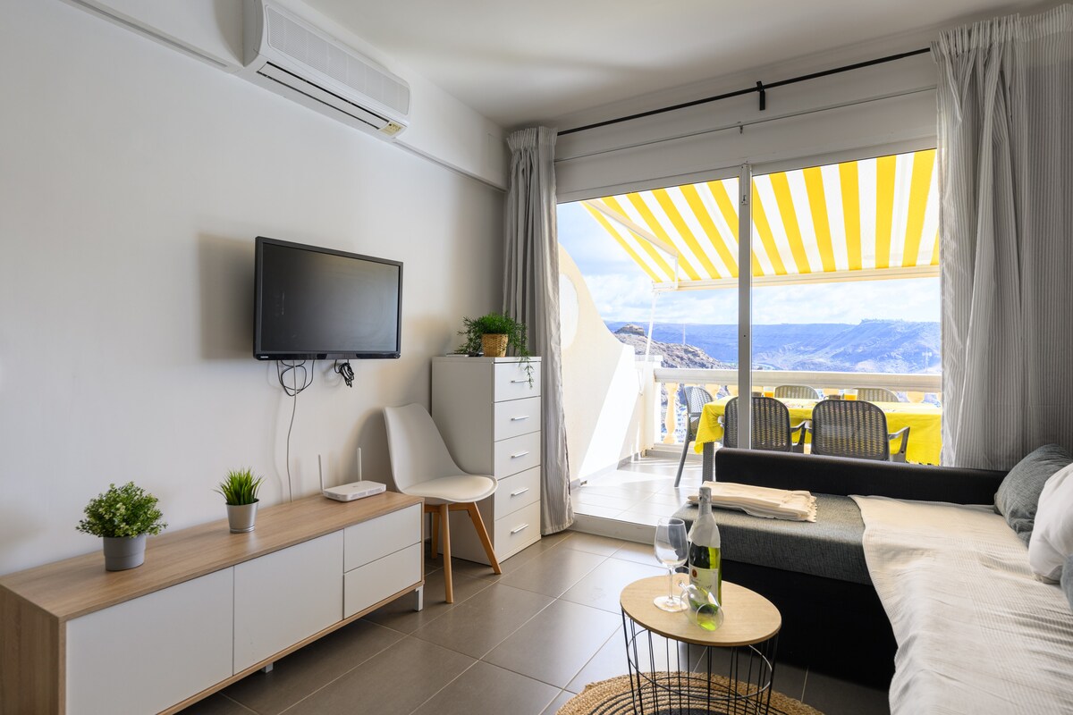 Te va a encantar este elegante apartamento con magnificas vistas al Océano Atlántico, en Playa del Cura a 10 km de Puerto de Mogán. Pisicna CLIMATIZADA todo el año - Aire acondicionado en salón y dormitorio. 1 Dormitorio. Salón, cocina, baño y espléndida terraza privada de 18 m2 con toldo motorizado abatible. ENTRADA --> 15:00 hasta 20:00. SALIDA --> 11:00. Máx ocupación: dos adultos + 1 niño ( 3 personas)