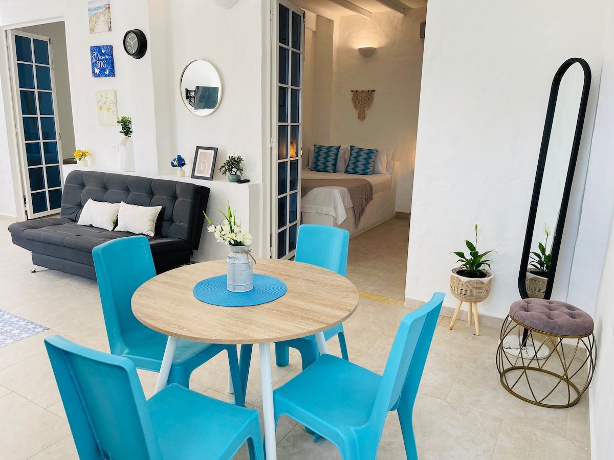 Hermosa casa mediterránea con terraza en el Santorini Colombiano Doradal, 2.5km de la Hacienda Nápoles, 20 minutos de reserva Natural Rio Claro, cerca al terminal de buses, restaurantes, supermercado y farmacias. La casa es ideal para familias y grupos de amigos. Cuenta con aire acondicionado y ventiladores en todos los espacios, 2 habitaciones, 2 baños, comedor y cocina dotada, lavadora. 2 camas dobles, 1 camas sencillas y un sofá cama doble en la sala y tv (capacidad 7 personas).