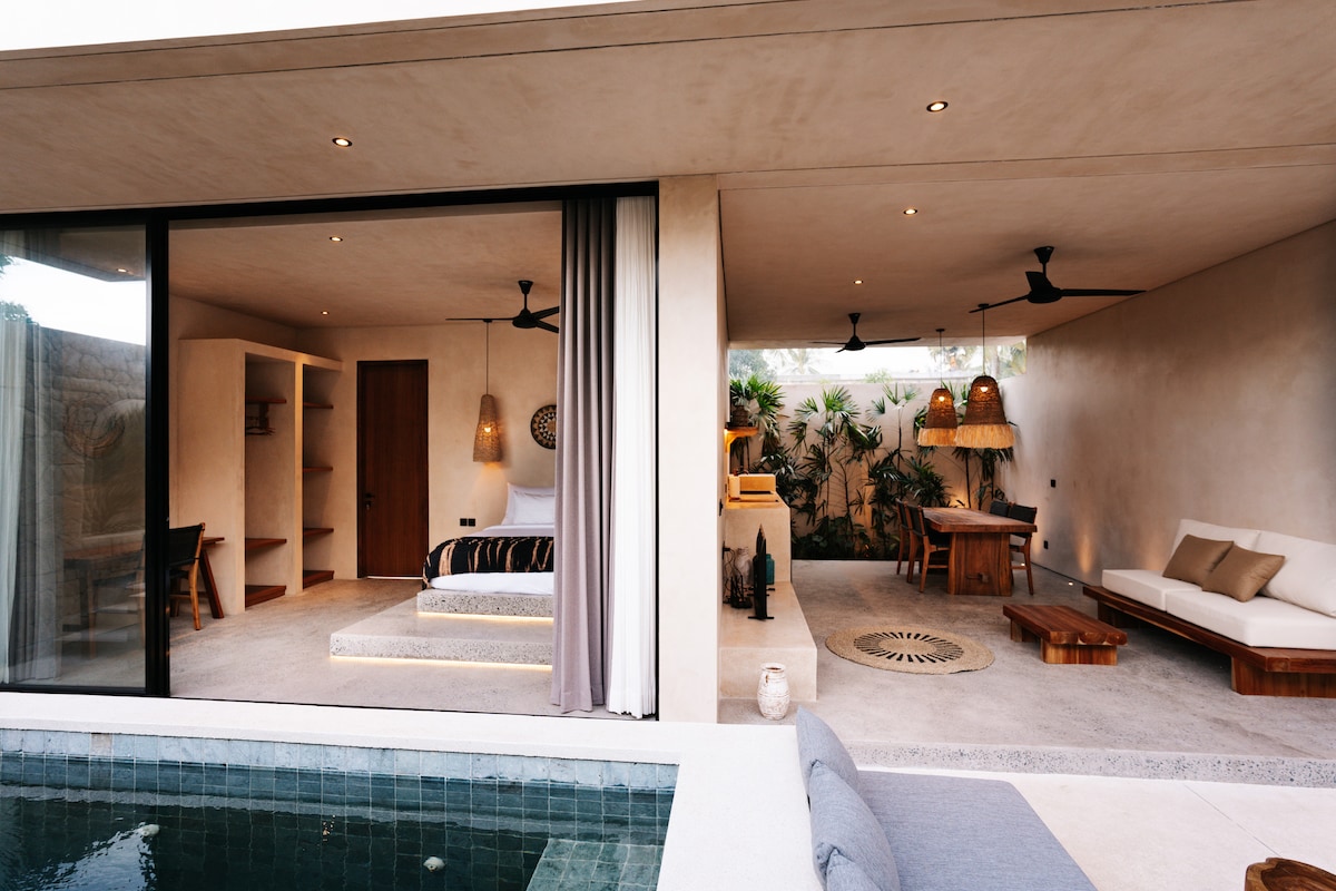 Promoción especial: construcción cerca Entra en la nueva y lujosa villa 1BR enclavada en una zona serena en el corazón de Kuta. Tias Villas es un refugio relajante cerca de todos los restaurantes, tiendas, playas, gimnasios y estudios de yoga. Explora los mágicos alrededores o relájate todo el día en el jardín tropical junto a la piscina privada. ✔ 1 habitación cómoda con cama tamaño king ✔ Cocina totalmente equipada. ✔ Jardín con piscina privada ✔ Espacio de trabajo Wifi ✔ de alta velocidad Acceso ✔ gratuito al gimnasio Xeno (a 300 metros de la villa)