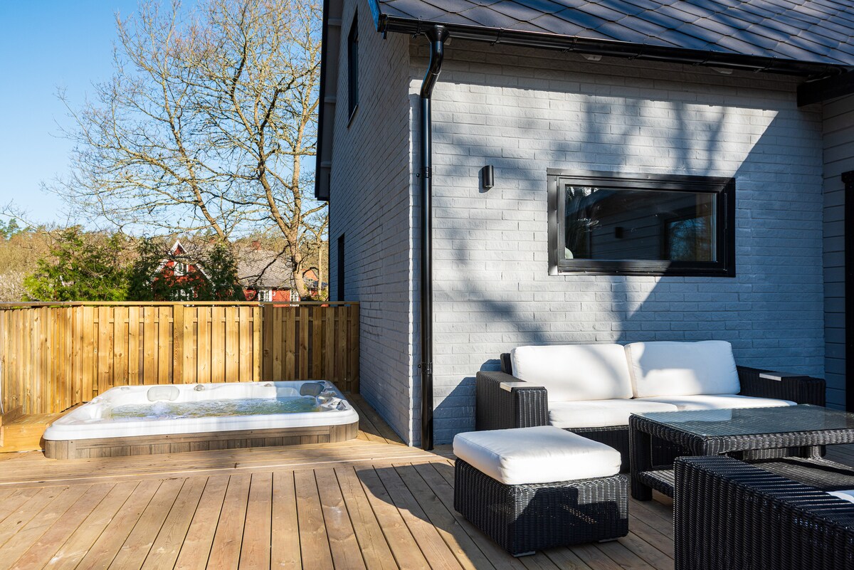 La moderna villa con vistas al mar para la familia ofrece un alojamiento cómodo. Grandes secciones de ventanas frente al mar y un gran jardín compuesto por acantilados y césped, con varios lugares para sentarse y relajarse. ¡Disfruta del ambiente y de la fantástica vista! El porche delantero más pequeño de la casa ofrece refugios acogedores y tranquilos con sol todo el día. Sigue el camino corto a una playa privada más pequeña,(apta para niños), compartida con otra casa. Mar poco profundo ideal para niños y/o SUP. Cerca de Sweden Rock.