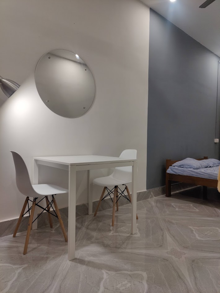 Una casa vibrante y estética decorada con la sensación de Santorini, Grecia, en tonos blancos y azules. Está diseñado en un estilo de planta abierta que ofrece mucho espacio para los huéspedes. Los huéspedes podrán acceder a toda la segunda planta del edificio. Es un 1bhk totalmente amueblado y ninguna de las habitaciones se comparte con otros huéspedes. **El aire acondicionado se cobrará a 300/- extra por día**