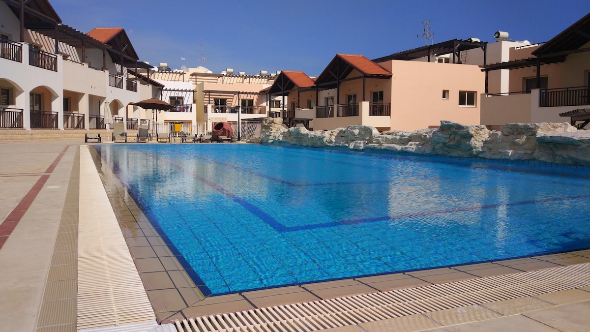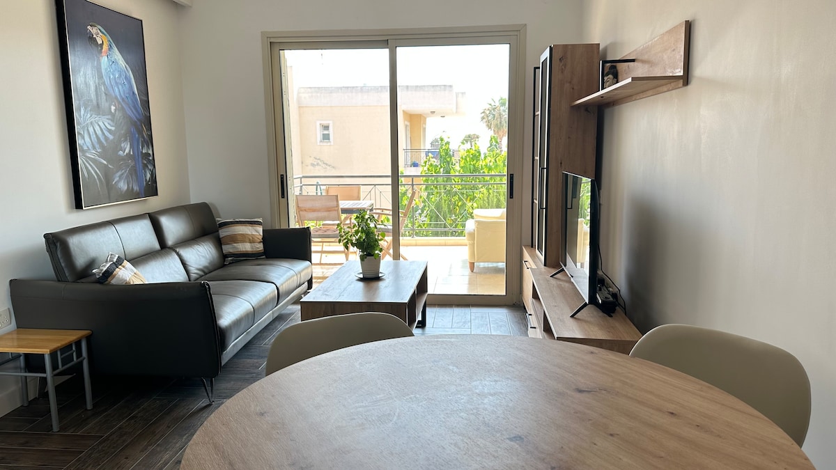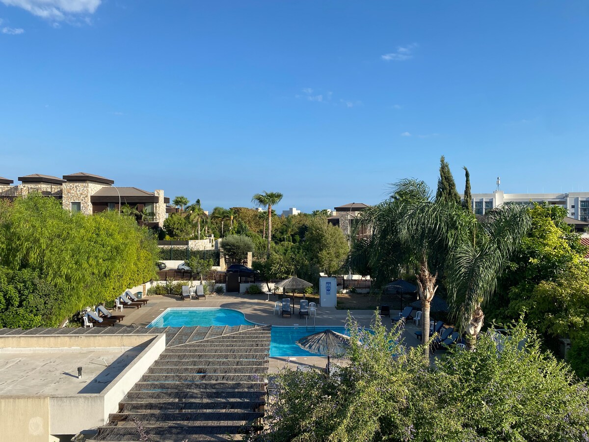 Cosy studio at Palm Beach gated complex just accross the beach with a big swimming pool, tennis court, huge garden a barbecue area, free parking and amazing patio view. All essential kitchen appliances available as well as smart TV & WiFi 200mb Superb location closed to all amenities, bakery, supermarkets, restaurants, cinema, famous beach bars & night clubs. Bus coastal line available to the historical center and beach locations. The studio has been recently redecorated and looks stunning.