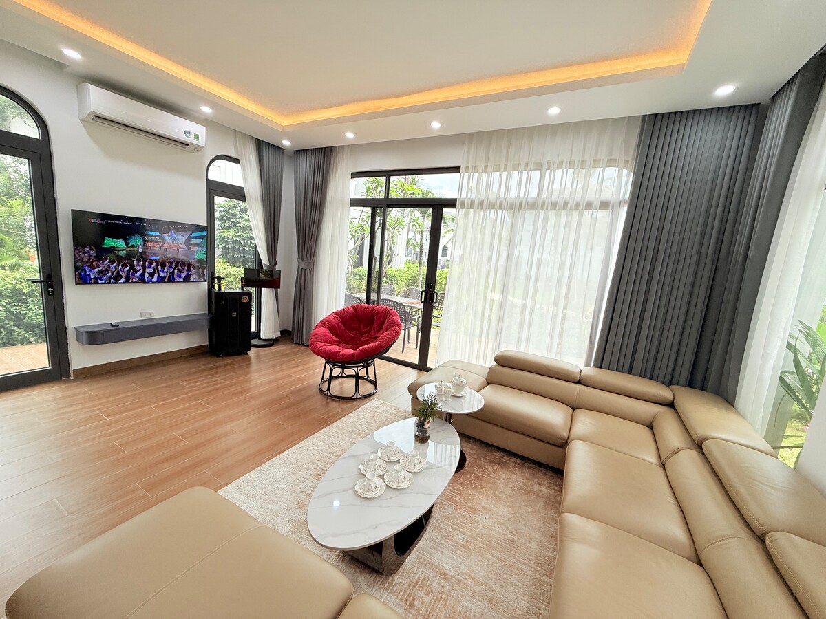 Homes Villa tiene una gran superficie de hasta 200 m2, que incluye 3 dormitorios, salón, comedor, mesa de barbacoa al aire libre y cocina totalmente equipada. Además, la villa también cuenta con una piscina comunitaria interna y un jardín verde, creando un espacio relajante del centro vacacional y disfrutando de la hermosa naturaleza. Homes Villa es moderna y lujosa con muebles de clase alta, lo que crea una sensación acogedora y cómoda para los clientes