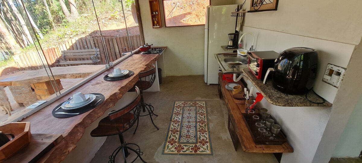 🏠ENTRE EL TRÉBOL DE CHAPADA Y EL PUEBLO DE LAVRAS NOVAS, hay DOS chalets individuales. Disfrutarás de una experiencia muy mía, en este pequeño lugar decorado con artesanías locales, un patio trasero con estufa de leña, fuego de piso, tumbonas, redes de descanso y hamacas suspendidas, justo enfrente de una vista de lo más hermoso del mundo, la Serra do Trovão, ornamentada por un valle que mezcla el Bosque Atlántico y el Cerrado. ¡Venga a disfrutar de una experiencia sencilla y reconfortante en nuestro pequeño rincón!🌻