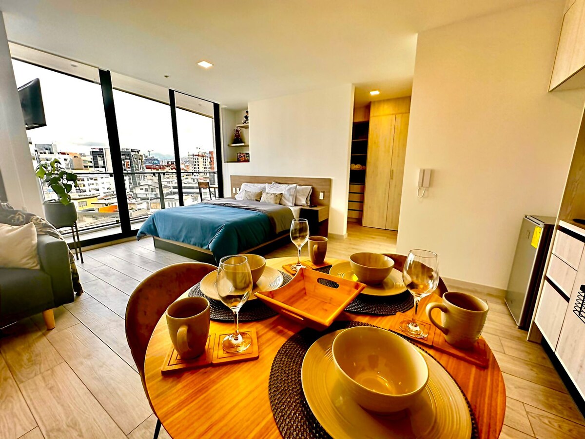 Estudio moderno y nuevo en el piso 14 con vista directa al Parque La Carolina. Amenities del estudio: • Wifi de fibra óptica • TV QLED Smart 55” • Cama ultra cómoda • Cocina equipada • Baño moderno • Smart lock • Seguridad 24/7 Áreas sociales (piso 17): • Gimnasio • Área de coworking con WiFi • Sala de juegos • Área BBQ • Jacuzzi (uso disponible solo para estadías mayores a dos noches) Ubicación estratégica, a 15 minutos del Metro de Quito, malls y restaurantes.