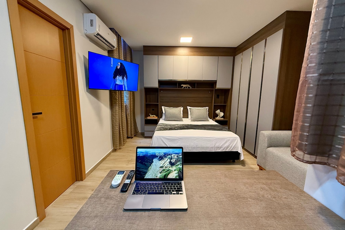 Nuestro estudio está totalmente equipado y diseñado para ofrecer comodidad, practicidad y modernidad. Aspectos más destacados del espacio: Aire ❄️ acondicionado frío y caliente 📺 Smart TV TCL de 43'' 🍳 Cocina completa 🛏️ Cómoda cama + sofá para relajarse Ajuar ✨ exclusivo del hotel de Alexandre Herchcovitch 🧺 Plancha y secador de pelo Baño 🚿 nuevo 💡 Iluminación LED para mayor comodidad 🌐 Internet rápido Ideal para quienes buscan practicidad y una ubicación estratégica en São Paulo.