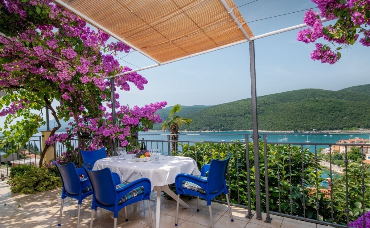 Te invitamos a nuestro apartamento, Dora Mar, que cuenta con una vista impresionante de la bahía de Kvarner. Recientemente reformado, ofrece comodidades modernas de la más alta calidad. Perfecto para dos parejas, un retiro familiar o una cómoda estancia en casa con oficina. Disfruta de total privacidad con acceso a una amplia terraza con toldo, muebles de patio y tumbonas.