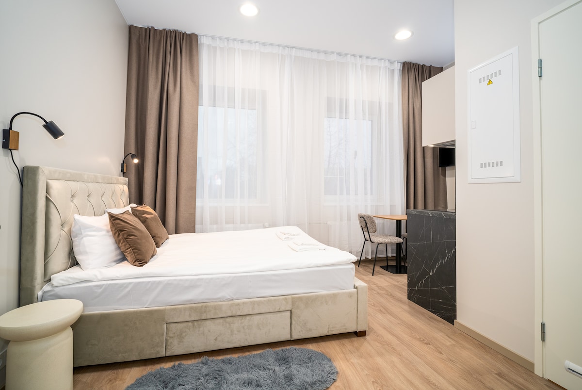 Renovated Comfort Studio-Apartment with double bed at "13 North Studios" offers aparthotel-style comfort and unbeatable location! Enjoy 24/7 self check-in and stay minutes from everything—Tallinn Airport, Bus Station, Rail Baltic, tram stop, and major shopping centers. The apartment offers a smart flat screen TV, a free wi-fi, a private bathroom with walk-in shower, kitchen, dining table, fridge, stovetop, kettle, and kitchenware. Perfect for modern, easy city stays with free on-side parking.