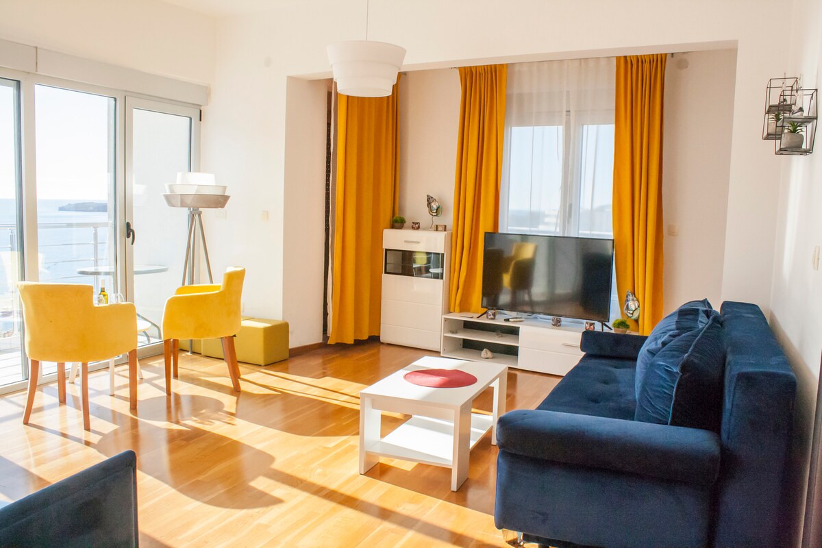 Se ofrece un nuevo apartamento con estilo con vistas al mar, diseño original y una cómoda solución de diseño. Los huéspedes disponen de un dormitorio separado, un amplio salón con cocina equipada y barra de bar. Ambas habitaciones tienen smartTV, calefacción y aire acondicionado. Todas las ventanas tienen vistas al mar y la terraza ofrece una vista fascinante de la isla, uno de los principales atractivos de Budva. El apartamento se encuentra a 5 minutos en coche de la playa y del casco antiguo de Budva. Y a 17 km del aeropuerto de Tivat.