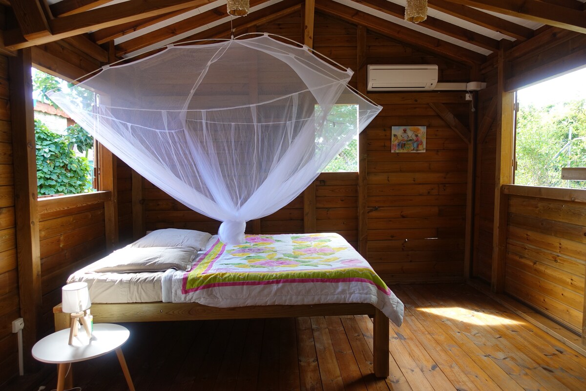 Charmant bungalow en bois, classé 3 étoiles ( pour 2 personnes mais pouvant accueillir jusqu'à 4 personnes) situé à proximité immédiate du bord de mer et de ses plages. Il a été construit dans l'esprit "cabane" et il se situe dans un endroit bien ventilé à l'entrée de notre jardin. Vous profiterez au réveil du lever de soleil sur la terrasse. Au coucher, vous serez enivrer par le parfum d'Ylang Ylang et bercer par le chant des grenouilles.
