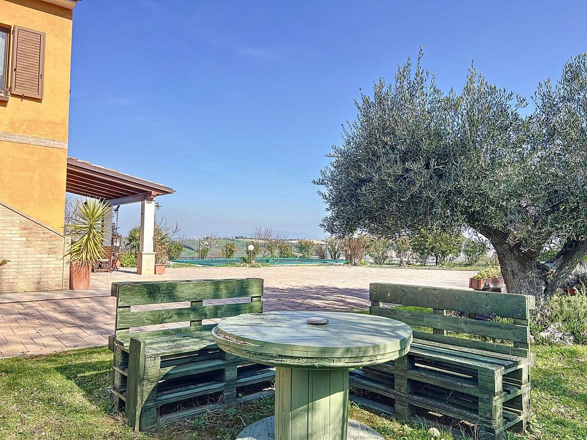 Casa de campo que ofrece momentos de tranquilidad en un ambiente sereno, producimos vino DOC y aceite de oliva virgen extra. Las Marcas están llenas de maravillas que nos regala la Madre Naturaleza: el mar, las montañas, los valles salpicados de ríos, las gargantas y los pasos naturales de los Apeninos, o construidos por la sabiduría de artistas de renombre. Pero las obras creadas por la sencilla mano del agricultor no desfiguran el paisaje que se abre ante tus ojos. «...que el paseo sea ligero para ti, viajero, y el corazón, ligero».