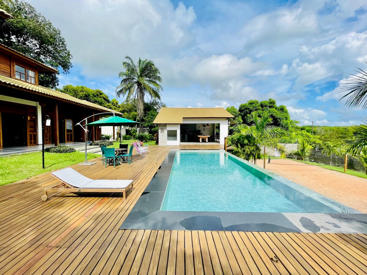 Casa a beira mar na Praia de Panaquatira, casa toda em madeira de lei, a casa dispõe de piscina acesso a praia, possui 5 quartos todos com suíte, mesa de bilhar, churrasqueira, banheiros masculino e feminino na área externa, área ampla para sua família, Wi-fi. A casa de vidro externa não é climatizada.
