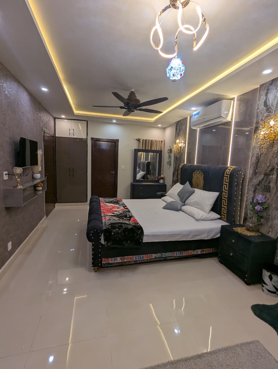 • Moderno y elegante: un dormitorio contemporáneo que pone el foco en la comodidad y el diseño. • Cama cómoda: cuenta con una cama con un cabecero tapizado de color claro y una colcha blanca. • Detalles de la mesita de noche: Dos mesitas de noche a juego, cada una con una lámpara y detalles decorativos. • Fondo elegante: situado frente a una pared con efecto de mármol texturizado, añadiendo un toque de lujo. • Aire acondicionado: equipado con aire acondicionado para tu comodidad.