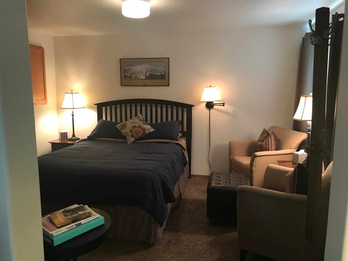 Estudio tranquilo y elegante, convenientemente ubicado en la ciudad central de Redmond, a 3,5 millas del aeropuerto, a 7 de Smith Rock, a 14 de Bend y a 18 de Sisters. Cerca de restaurantes y tiendas de comestibles. Impecablemente limpio, con todos los toques personales que esperas y comodidades perfectas para dos. Cocina totalmente equipada, mesa para comidas o espacio de trabajo, TV inteligente de pantalla grande (servicio de Direct TV), wifi 5G, aire acondicionado. Aparcamiento privado, acceso directo a la lavandería. No podemos aceptar mascotas.