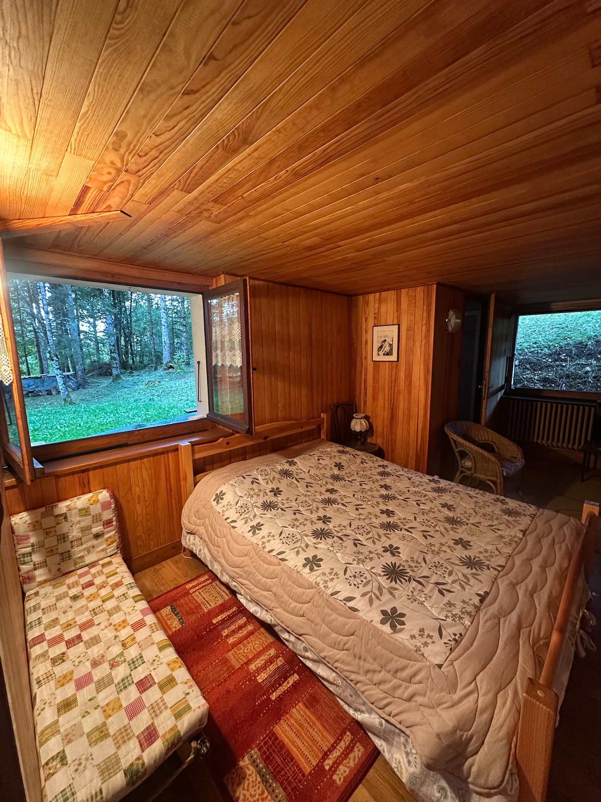 Hola, gracias por echar un vistazo a nuestro pequeño chalet en el bosque :) Si te gusta la naturaleza, este es el lugar ideal. Observa ciervos salvajes, ve a esquiar, a hacer senderismo, lleva nuestras raquetas de nieve a una aventura o simplemente ven y relájate en nuestra bañera de hidromasaje alimentada con leña. El chalet es acogedor y moderno, de planta abierta con un bonito fuego para sentarse junto a él. Es ideal para 2, pero también pueden caber 4 personas. Con 2 terrazas exteriores, puedes desayunar y cenar al sol.