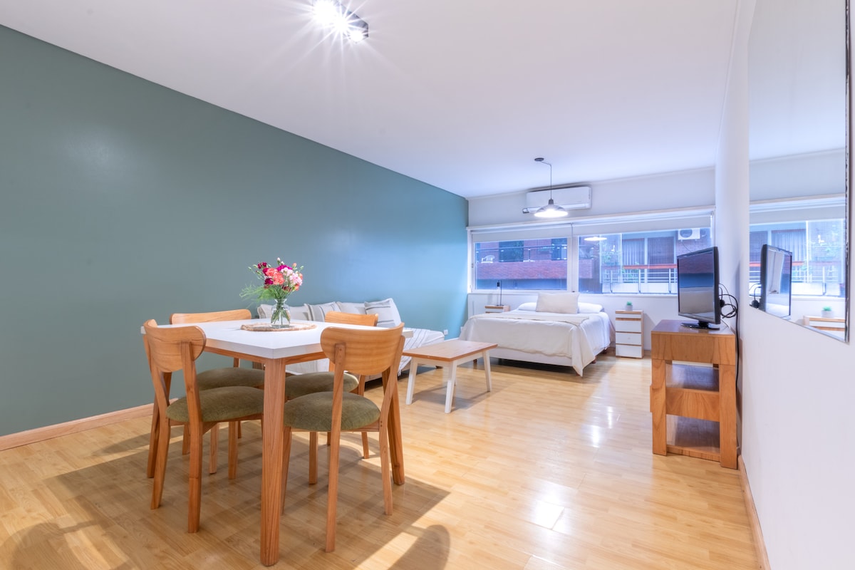 Bienvenidos a nuestro moderno estudio en el centro histórico de Buenos Aires, ubicado en el piso 14. Este espacio ofrece comodidad, seguridad y acceso a los principales puntos turísticos. Situado en una zona tranquila cerca de la Plaza de Mayo, con vistas espectaculares desde su balcón privado. Seguridad 24/7 y cerradura electrónica. Cocina completamente equipada. El edificio cuenta con piscina en la terraza, coworking, museo de sitio, cochera, laundry, auditorio, cafetería y restaurante.