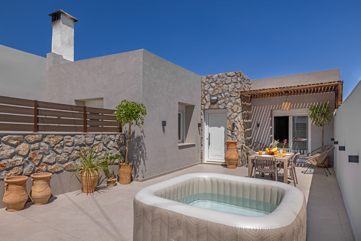 Un alojamiento que combina el carácter de la isla griega con las comodidades de la vida moderna. Un refugio tranquilo con una vista idílica del mar Egeo, que ofrece la relajación que todos buscan en las vacaciones. Disfruta de un spa privado climatizado para la máxima tranquilidad, una acogedora sala de estar con vistas al mar, una cocina totalmente equipada, un baño y un dormitorio con cama de matrimonio. Rodeado por un gran jardín mediterráneo con aparcamiento, está a solo 3 minutos en coche o a 10 minutos a pie de la playa de Stegna.