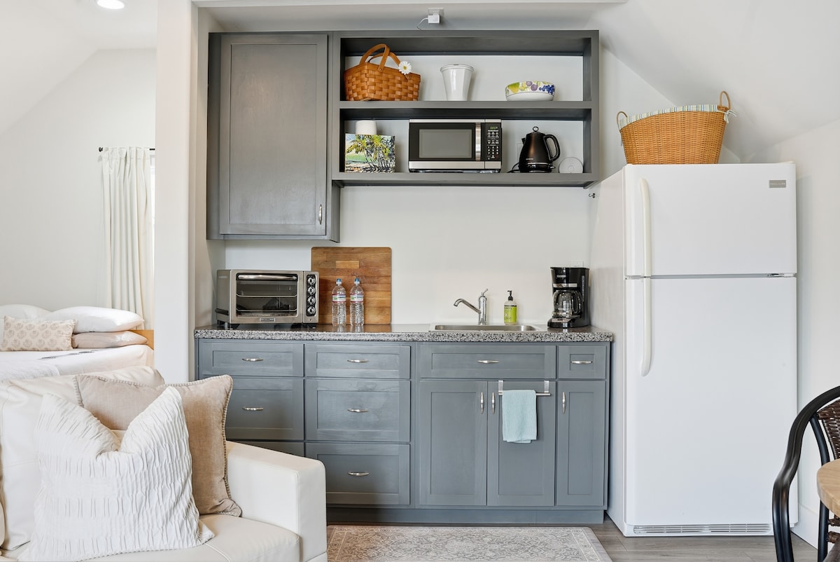 Magical in all seasons! Soothe your soul with an unforgettable escape, surrounded by nature and suspended twenty feet above a babbling brook! Listen to the rushing water and the bamboo whispering in the breeze, take in a sunset, or wade in the creek below. We hope you’ll enjoy this unique covered bridge conversion, expanding from bank to bank with a 50-foot front deck. Breakfast provided the first day includes fresh fruit, a half dozen eggs, and muffins, coffee and tea.
