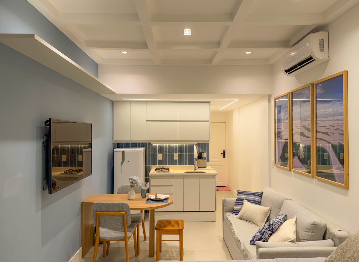 Loft recién reformado, con decoración limpia, cerradura digital, dormitorio y sala de estar integrados con cocina americana y totalmente equipada. Moderno y seguro, este alojamiento se encuentra en un condominio con conserjería 24 horas y cámaras de seguridad, en una de las mejores ubicaciones de Copacabana (posto 5), junto al Museo de la Imagen y el Sonido, con vistas al mar, rodeado de una amplia variedad de servicios, como bares, restaurantes, lavanderías, mercados, bancos.