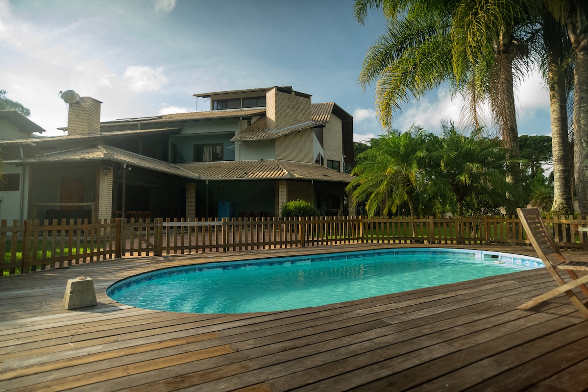 Un lugar único para disfrutar con familiares y amigos. También es ideal para hacer deporte (fútbol, senderismo, correr, ciclismo y natación). 04 acogedoras suites y una gran área social con juegos, chimenea, TV, Wi-Fi y una cocina equipada con estufa de leña, barbacoa, estufa, horno, microondas y bodega. En la zona, una gran terraza y una piscina semi olímpica climatizada. También en la propiedad, tenemos el rancho de ovejas, el campo de fútbol, el rancho de barbacoa y el estanque.