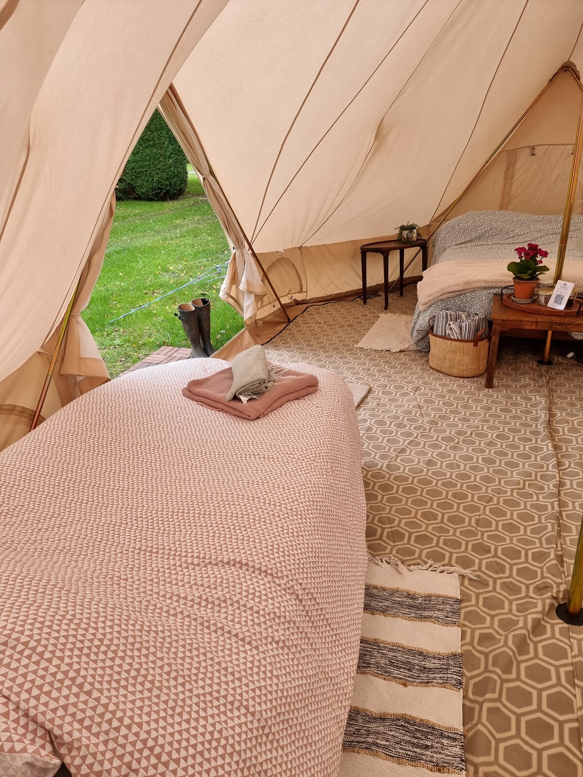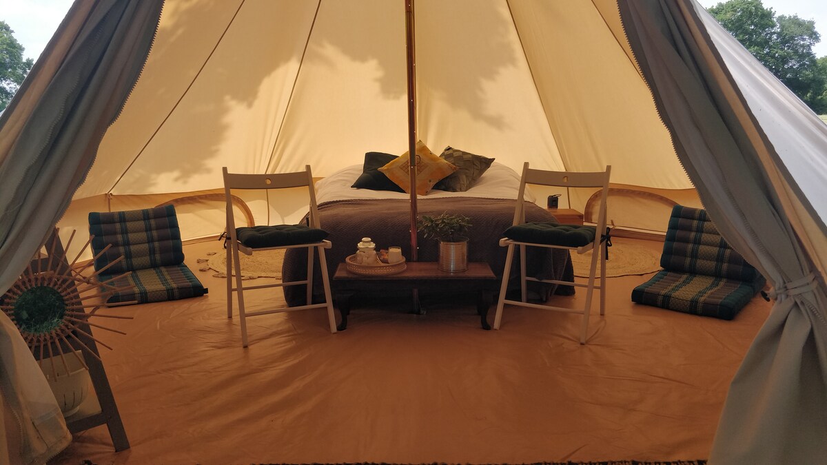 Nuestra tienda de campaña con cama super-king y ropa de cama de lujo está perfectamente ubicada en medio de un maravilloso campo. Hay muchas actividades, lugares para ver y eventos a nivel local. Los paseos son directamente desde la tienda. El pub local, que sirve comida casera y cervezas locales, está a 3 minutos a pie. Ofrecemos una placa de inducción, nevera/congelador, barbacoa, microondas, hervidor y tostadora. Podemos preparar 2 colchones autoinflables para niños si es necesario. La tienda está en su propia área privada de terreno para que la uses exclusivamente.