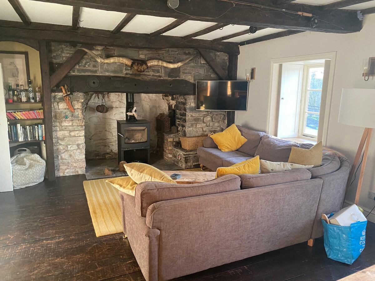 Set in tranquil countryside, on the Welsh Borders, down our private drive, a charming, spacious, 16th Century Tudor cottage enjoys beautiful views, secluded, walled, rose garden, private gate, secure for dogs. A perfect romantic cottage for couples. It boasts oak beams, ingle nook fireplace with wood burner and a large airy cruck beamed bedroom with stunning far reaching views east over Herefordshire countryside. Enjoy the morning sun over breakfast, near the open door and listen to the birds.