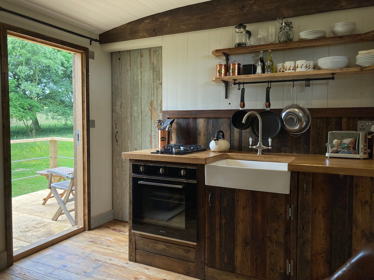 Our beautiful shepherd's hut sits in four acres of secluded woodland in rural Hexhamshire. Enjoy the peaceful solitude, with glimpsed views through the mature oaks onto the North Pennines. Surrounded by miles of footpaths, bridleways and moorland, there are walking, cycling and riding options in every direction. Nearby rural pubs offer delicious local ales and fantastic food. Or cook up something tasty over the firepit grill, then enjoy a drink on the raised deck in the evening sun.