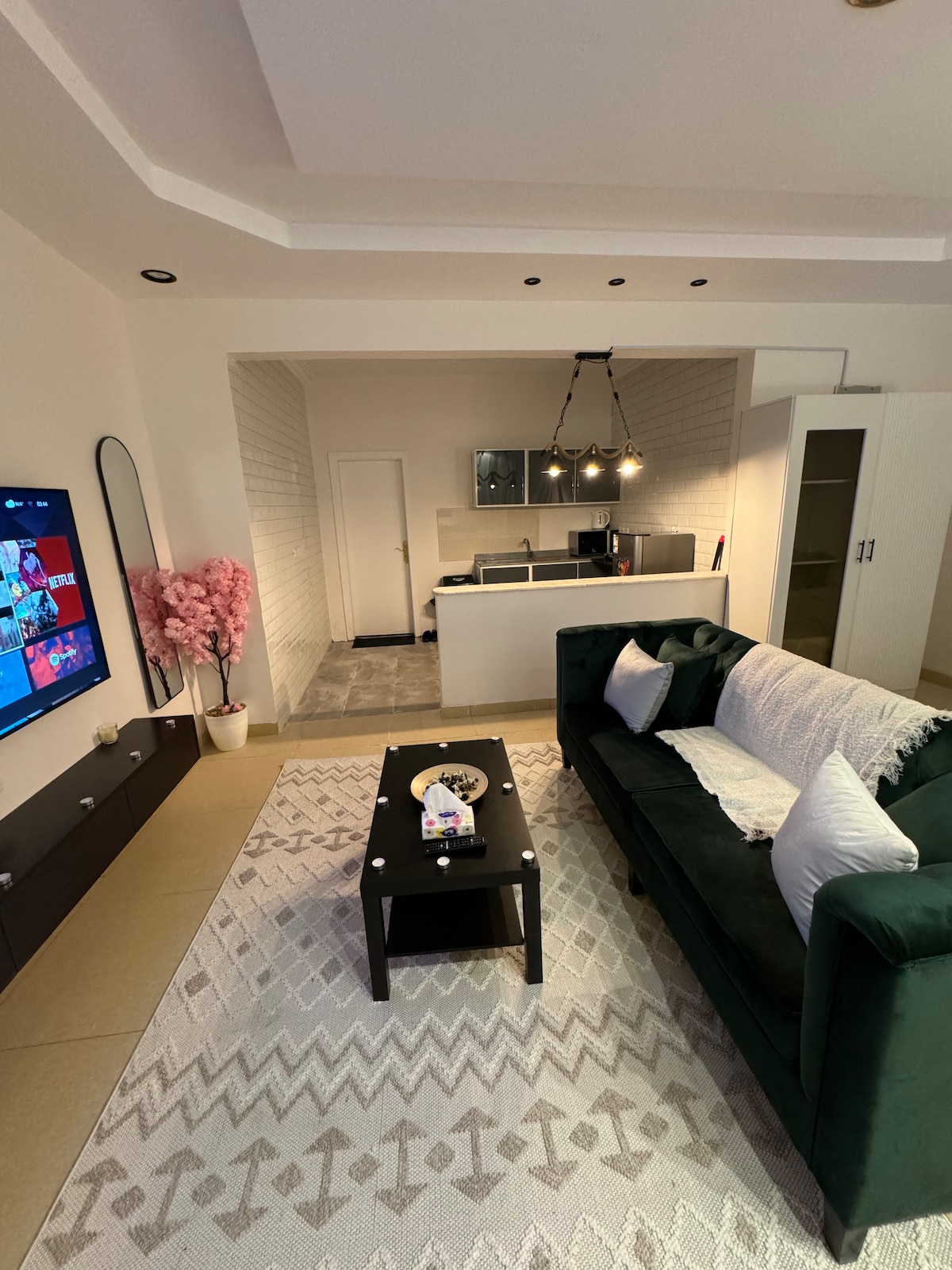 ¡Retiro de estilo bohemio en Al Narjis! Acogedor apartamento de 1 dormitorio con sala de estar, cocina equipada, 2 baños y una mesa de comedor para 4 personas. Las plantas naturales aportan frescura, la iluminación suave y los tonos cálidos crean un ambiente relajante. Perfecto para personas que viajan solas, parejas o estancias cortas. Wifi rápido, aire acondicionado y aparcamiento incluidos. Disfruta de comodidad, estilo y una estancia tranquila en Riad en un espacio nuevo y acogedor.