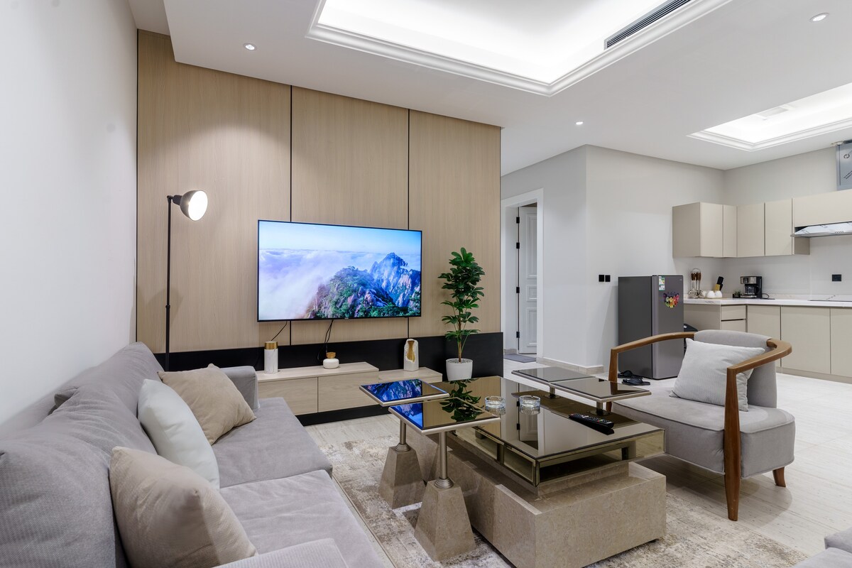 Estancia moderna, 1 dormitorio, TV inteligente de 70 pulgadas | 305 lavandería
