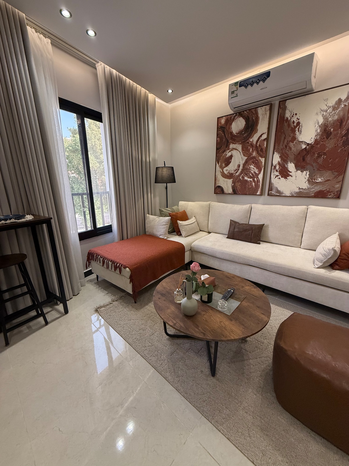 Si busca un apartamento que combine modernidad y comodidad, este moderno apartamento es la opción perfecta. Cuenta con una moderna sala exterior que incluye un cómodo columpio, lo que lo convierte en un lugar ideal para contemplar las torres y disfrutar de la brisa fresca, especialmente en las noches de invierno. El apartamento está equipado con una televisión inteligente y un amplio baño. El apartamento está equipado con todas las comodidades que necesita, incluido un pequeño balcón que le permite disfrutar de una deliciosa taza de café. La ubicación del apartamento está cerca de los mejores servicios de entretenimiento e instalaciones básicas. Todos los detalles de este apartamento mejoran la experiencia de la estancia y la hacen excepcional.