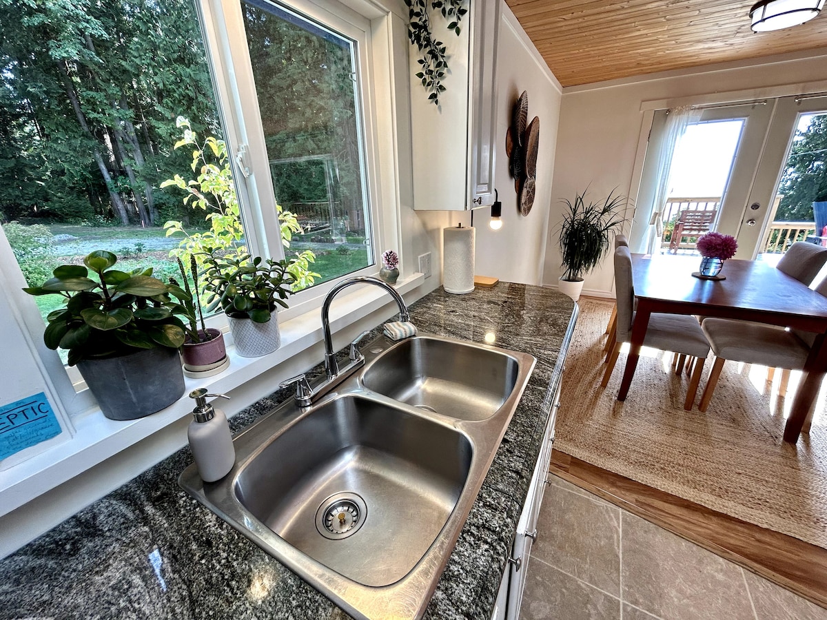 Esta casa de carruajes privada de concepto abierto está situada en una zona céntrica entre Bonniebrook Beach y Gibsons. Disfruta de las vistas al mar desde la sala de estar de arriba y la terraza. Amplio, abierto, luminoso y amueblado con buen gusto, incluyendo una cama tamaño queen con sábanas de calidad. Relájate o trabaja desde esta casa totalmente equipada con cocina, internet de alta velocidad, lavadora/secadora y TV inteligente. Hay mucho espacio para tu vehículo, bicicletas o kayaks. Las vistas al agua y la ubicación hacen de esta una acogedora experiencia de cinco estrellas :)