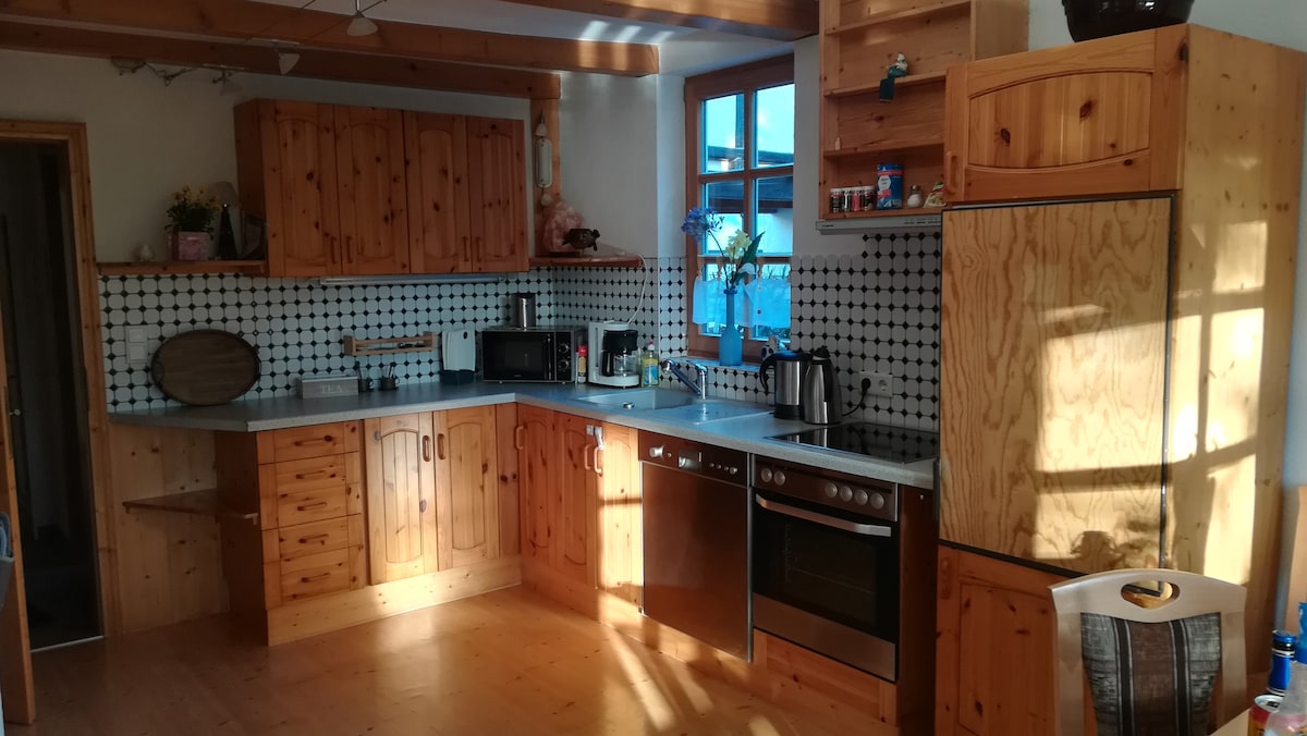 Nuestro apartamento de vacaciones se encuentra en un histórico molino rodeado de prados y campos, lejos del bullicio del pueblo. Mencionada por primera vez en 1311, es una de las propiedades más antiguas del lugar. La suite de invitados (Müllerstube) es un apartamento independiente en la planta baja de la casa y se puede cerrar por separado. Encontrarás una cocina con zona de comedor, un vestidor, un cuarto de baño con ducha y un amplio dormitorio con una cama doble y dos camas individuales.