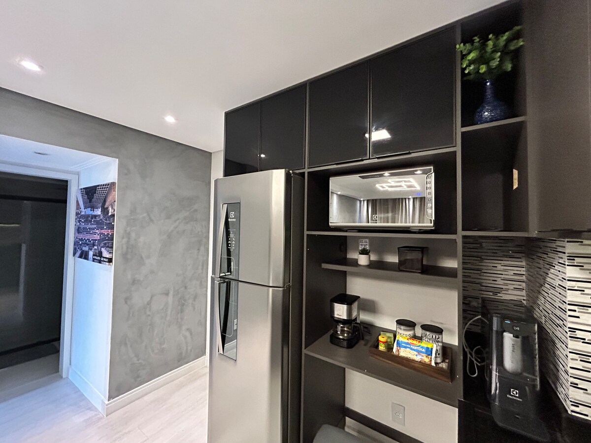 Apartamento con garaje, internet 350MB, amueblado, a 2 minutos a pie del centro comercial Jd Pamplona, a 10 minutos a pie de la Av. Paulista y metro Trianon MASP; a 15 minutos en coche del parque Ibiraquera, rodeado de la mejor gastronomía de SP y fácil acceso tanto por la Av. Nove de Julho como por la Av. Estados Unidos. Consta de una cama queen, sofá, mesa de comedor, cafetera, minibar, airfryer, microondas, aire acondicionado, servicio de limpieza, piscina, sala de masajes, sala de estar, sauna, autoservicio de lavandería OMO.