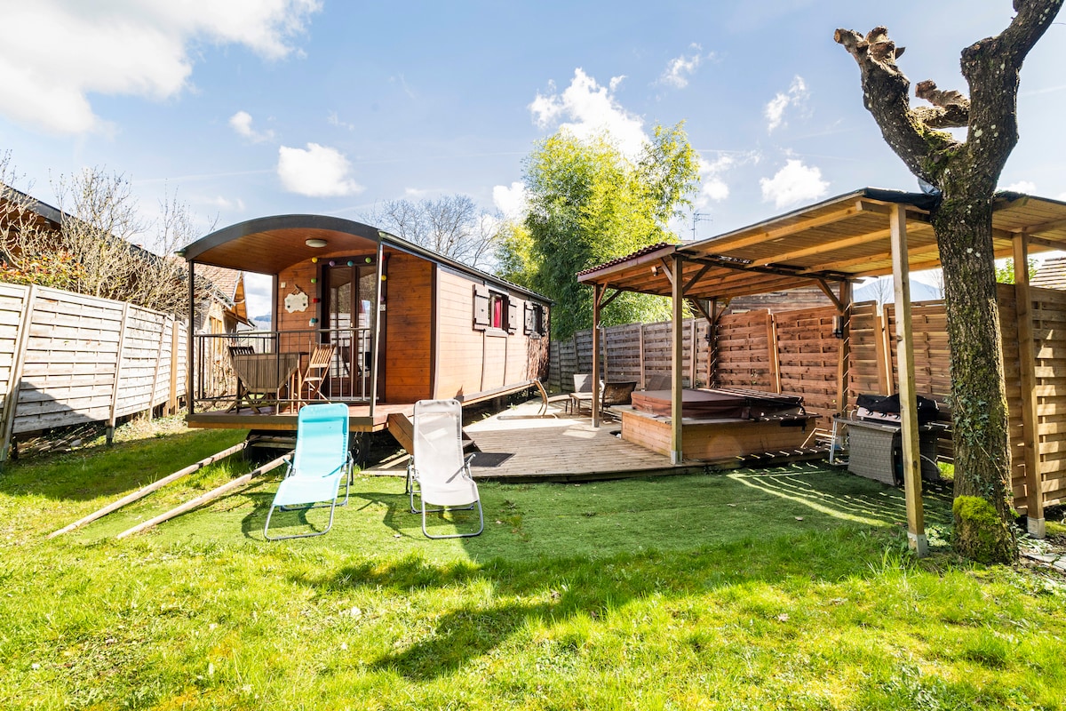 Puede encontrarnos en GreenGo, alternativa francesa eco-responsable. Encantadora caravana de madera, a 400 m del lago de Annecy, a 300 m del carril bici. A los pies de la cadena de Bauges, frente a La Tournette. Paseo ideal para una estancia romántica, accesible en familia. Para los amantes del senderismo, ciclismo de montaña o parapente, paseos tranquilos o nadar. Cocina interior Cocina exterior en un jardín de árboles frutales. Barbacoa eléctrica bajo petición.